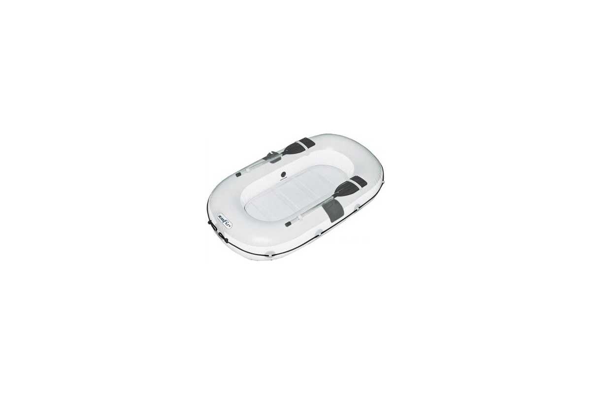 Balsa inflável semi-rígido confeccionado com tecido de poliéster 1100 Dtex de alta tenacidade, emborrachado com um composto à base de PVC nitrilico o único no mercadoque em sua composição contém 40% de borracha. Número de alças para transporte 2, 2 válvulas de enchimento tipo rápido e com pino trava, casco semi-rígido construído em fibra de vidro reforçada com acabamento em gel isofitálico com NPG e anti UV e por baixo tecido.