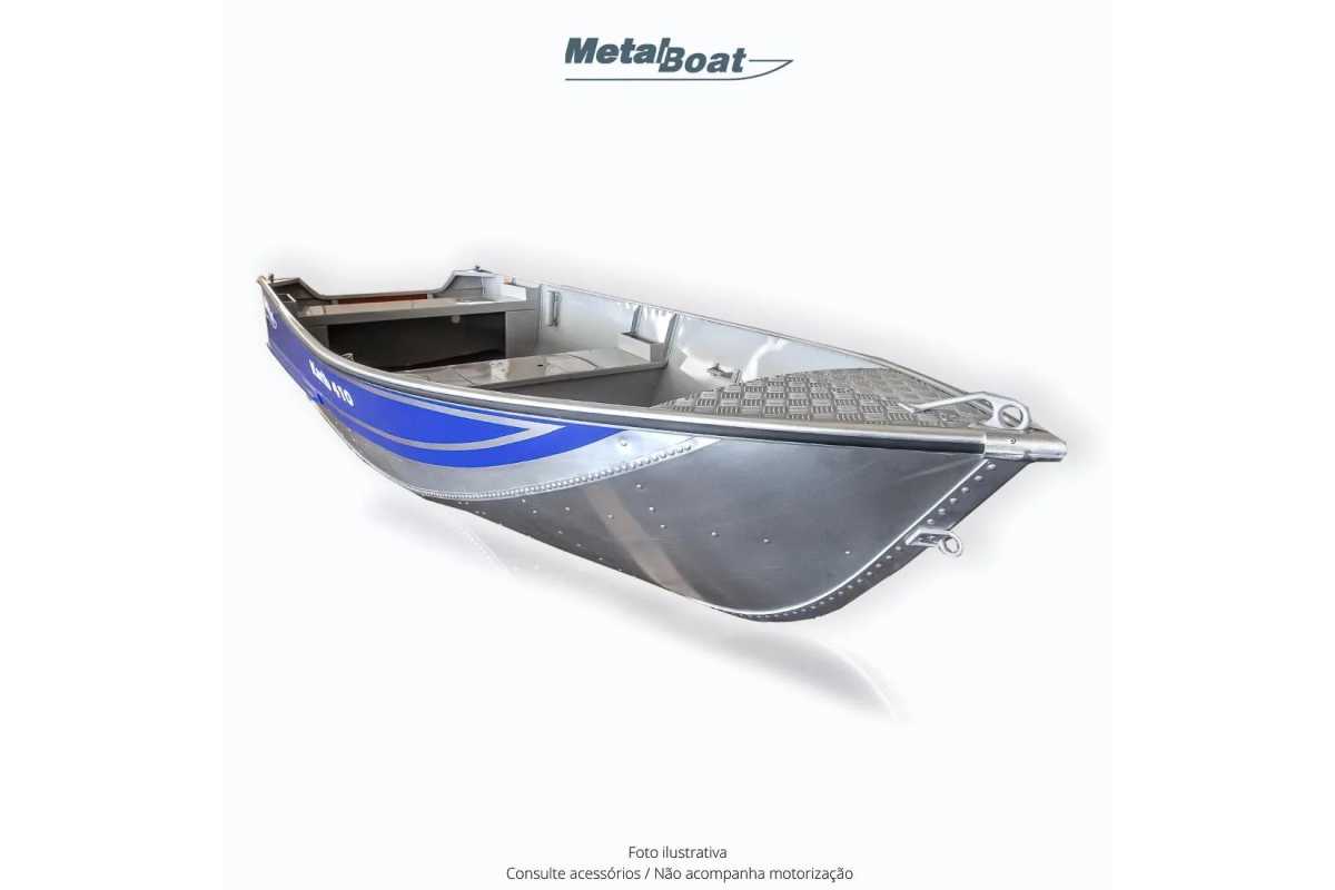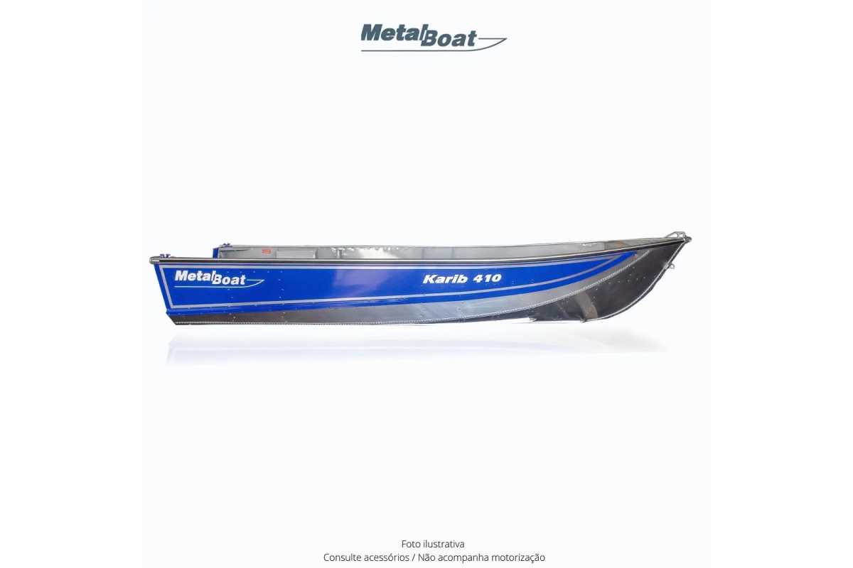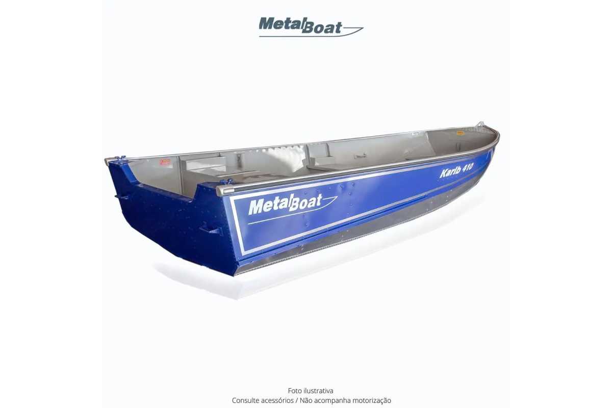 O KARIB 410 é um barco de fácil manuseio, apresentandoexcelente portabilidade devido ao seu baixo peso. Possuialojamento para tanque de combustível, com banco do pilotoem nível superior ao dos passageiros. Pode receber motoresde 7,5 a 15 HP e transportar até 03 pessoas.Obs.: Frete FOB Fábrica Metalboat / SP
