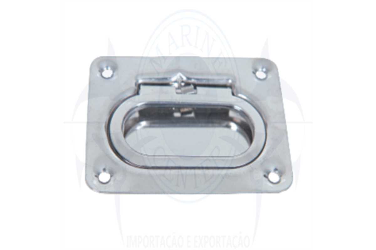 Em aço inox estampado, alça com mola de pressão. Dimensões: 57 x 76mm