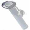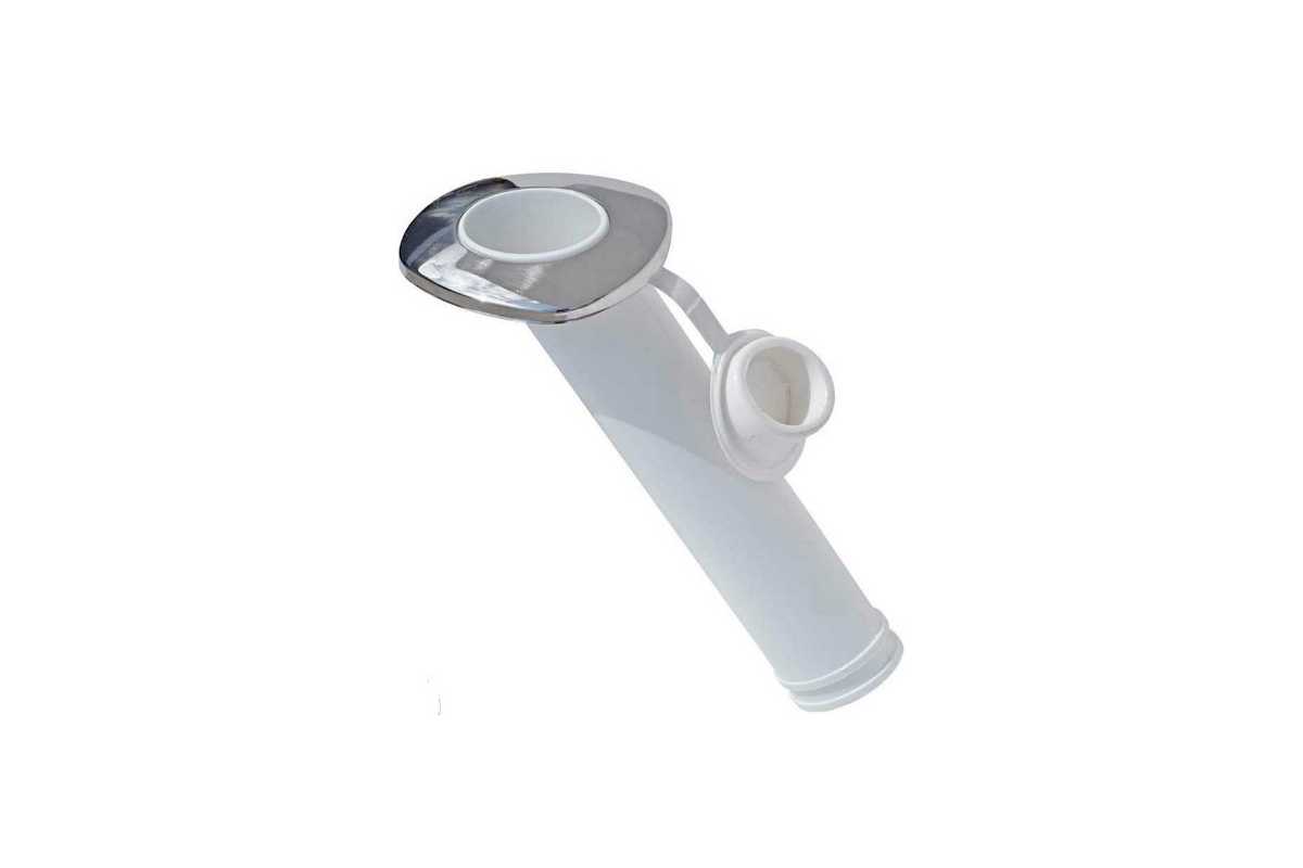 Em nylon branco, com acabamento em aço inox, com tampa de borracha, inclinação de 30 graus, fixado por parafusos, abertura de 44mm. Dimensões: 278xØ46mm